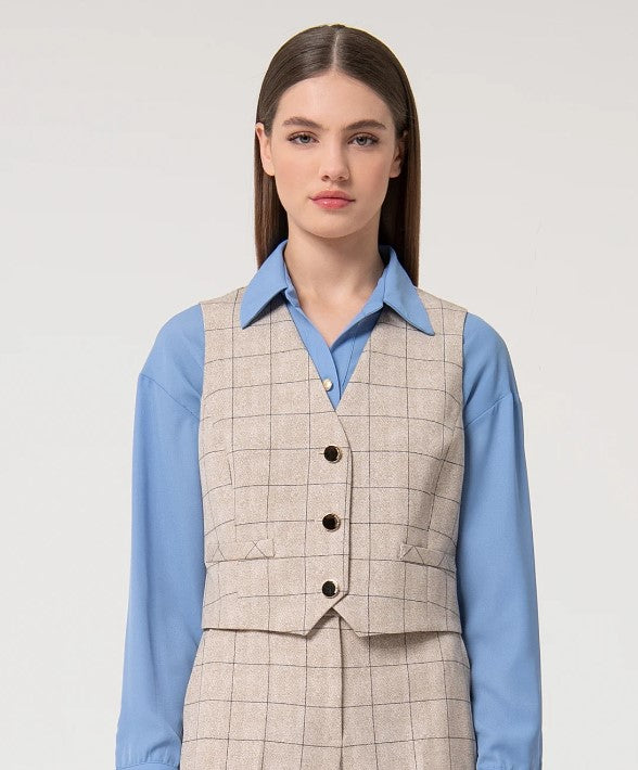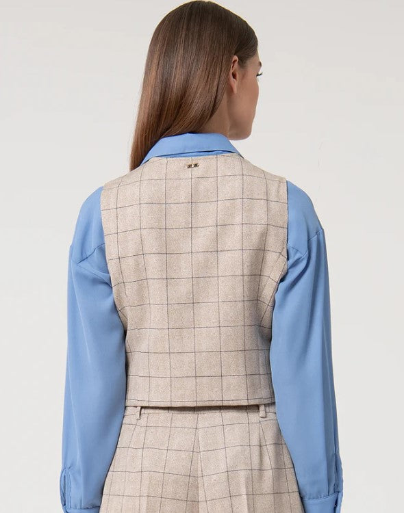 Colete Fracomina FS24WT2004W757N4, regular fit com padrão quadrado. Gola V caída, botões centrais para abertura, bolsos de aplicação e sem mangas.