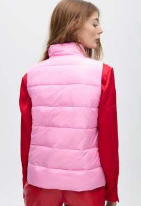 Colete acolchoado curto em tons vibrantes LF2501018. Design reversível para versatilidade. Possui fechamento em zíper visível e detalhe de logotipo na gola. Inclui bolsos laterais para maior funcionalidade.