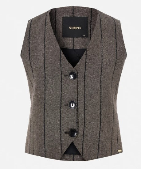 Colete Scripta 245099, em tecido fantasia. Aperta na frente com botões contrastantes. O caimento da peça é ajustável.