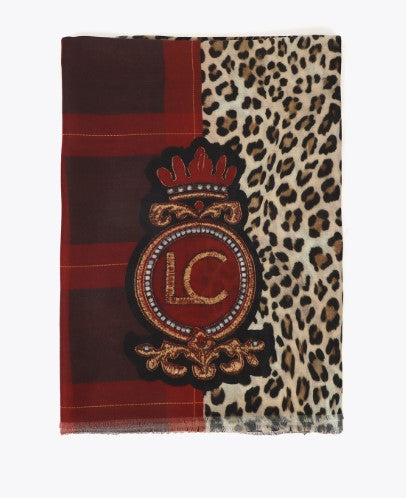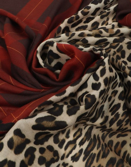 Lenço elegante que combina estampa animal com design tartan em tons quentes LF2507016. Feito de material suave e leve, com detalhes de emblema chamativos. Perfeito para adicionar um toque de estilo a qualquer visual.