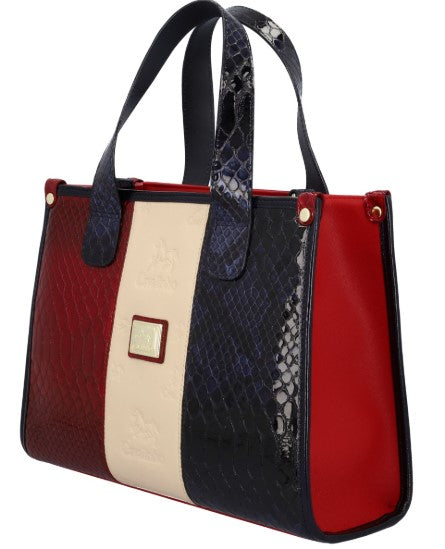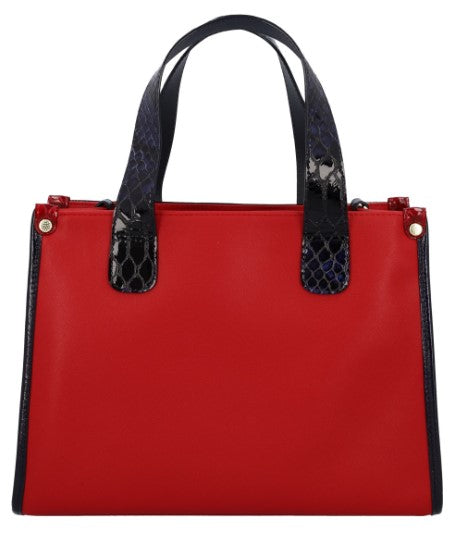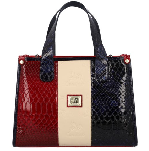 Mala de mão grande numa mistura de pele envernizada e genuína, 18190611.13.99. Divisória principal com forro em tecido, dois bolsos pequenos no interior e fecho de correr. Asa de mão larga dupla e alça de tiracolo removível. Idealmente utilizada na mão. Aplicações douradas. Mini bolso com fecho de correr e gancho no interior.