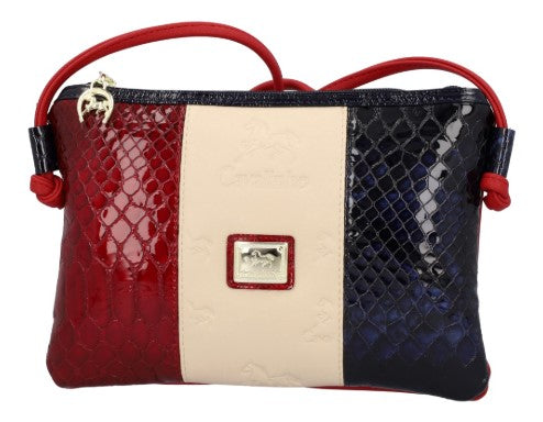 Mala de tiracolo pequena numa mistura de pele envernizada e genuína, 18190593.45.99. Divisória principal com forro em tecido, bolso pequenos no interior e fecho de correr. Bolso pequeno com fecho de correr na traseira da mala. Aplicações douradas.