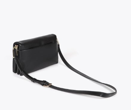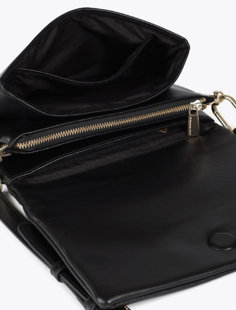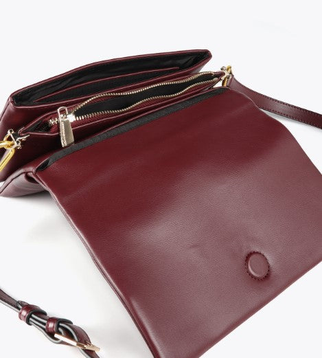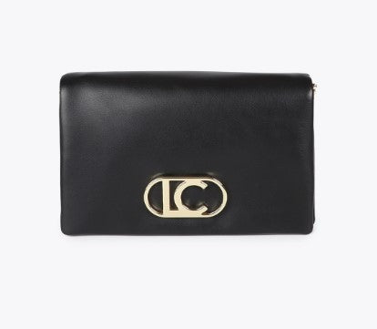 Bandoleira elegante com efeito pele LF2504003, desenhada com três compartimentos e aba frontal. Inclui fecho magnético e alça ajustável para maior conforto. Detalhe de logotipo metálico na frente. Ideal para manter seus pertences organizados.