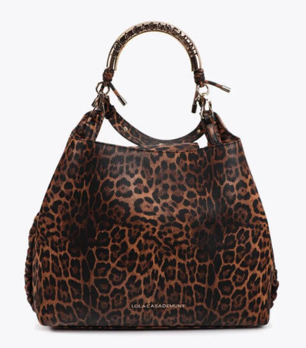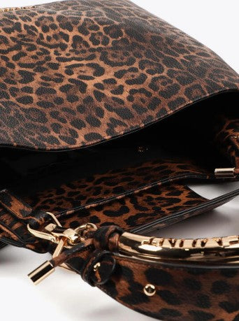 Bolsa shopper com estampa animal print e alças metálicas personalizadas LF2504036. Espaçosa, com compartimentos internos perfeitos para organizar suas pertenças. Ideal para um toque elegante e ousado. Inclui uma alça removível para maior versatilidade.