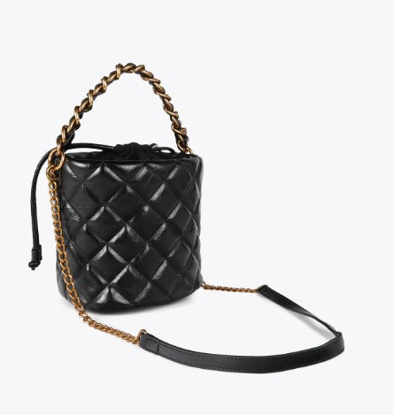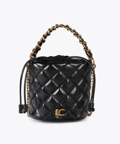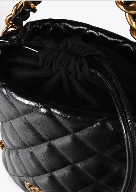 Elegante bolsa saco acolchoada com efeito pele, decorada com logo LC leopardo LF2504009. Fecho ajustável e alça de corrente dourada adicionam sofisticação.