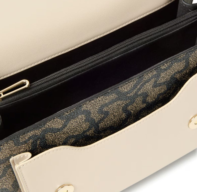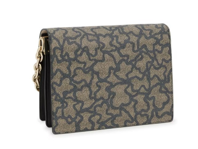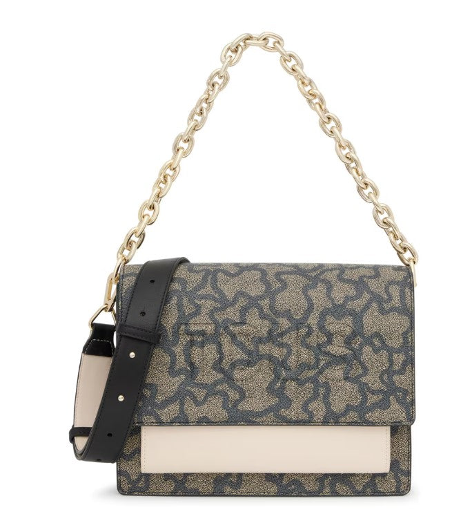 Mala de tiracolo média Audree TOUS Kaos Icon em lona com estampado Kaos na cor preta e pormenores em poliuretano 2001799559. Mala com duas divisórias separadas por um bolso com fecho de correr e um bolso exterior aberto à frente. Fecho de aba com dois botões magnéticos. Alça de ombro de corrente fixa e alça de tiracolo ajustável e removível.