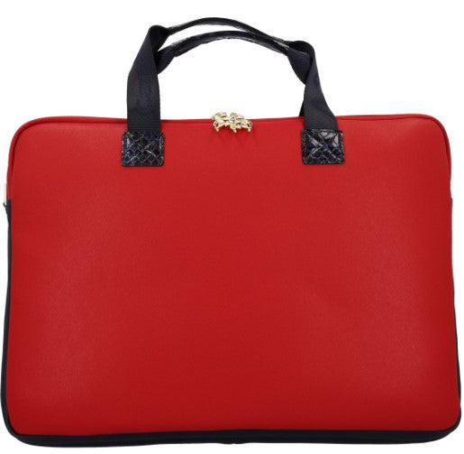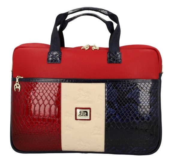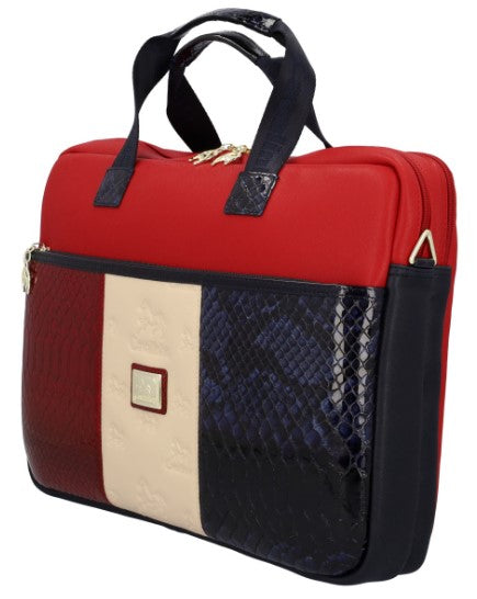 Pasta para portátil ou documentos numa mistura de pele envernizada e genuína 18190050.45.99. Duas divisórias livres, forro em tecido e fechos duplos de correr. Asa dupla de mão em tecido com reforço em pele envernizada e alça tiracolo, ajustável e removível, com proteção de ombro. Bolso médio com fecho de correr na frente da pasta. Aplicações douradas.