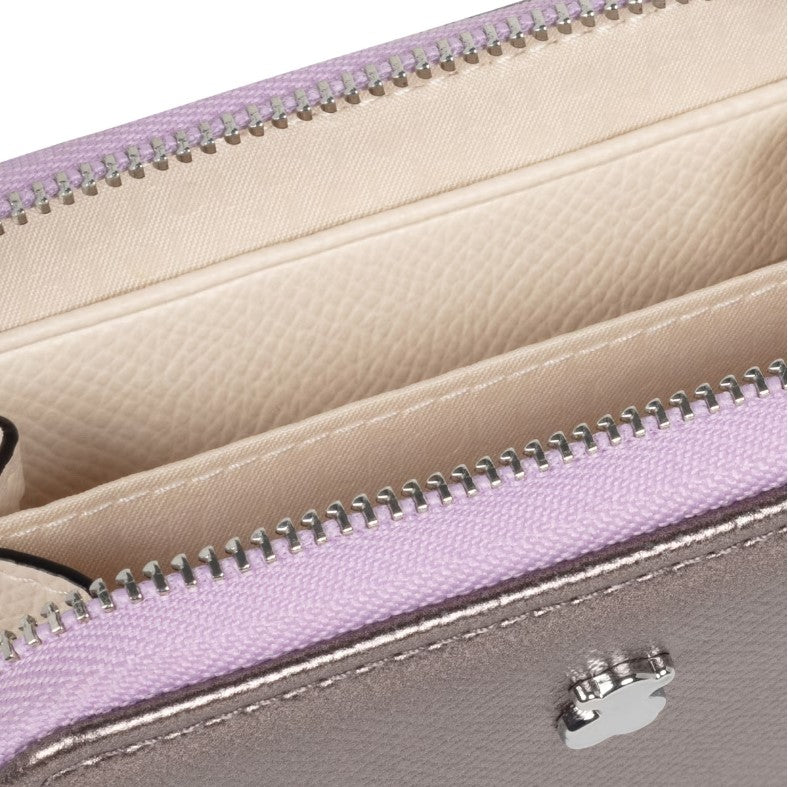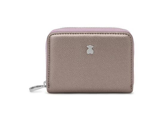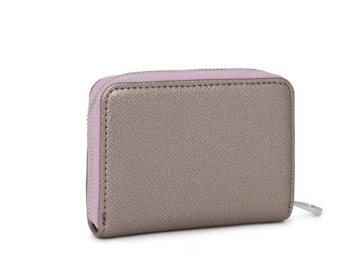 Porta-moedas médio TOUS da coleção New Dubai Saffiano 2001690055 em pele sintética Saffiano na cor prata, malva e bege. Fecha com fecho de correr. No interior dispõe de 2 divisórias para moedas e de 2 ranhuras para cartões. Medidas (altura x largura x profundidade): 8 x 11 x 3 cm