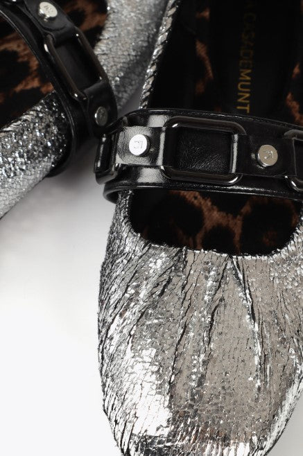 Sapato elegante com acabamento metalizado e detalhe franzido LF2505015. Possui uma alça decorativa com fivela ajustável. Palmilha interna acolchoada com estampa animal print. Sola antiderrapante.
